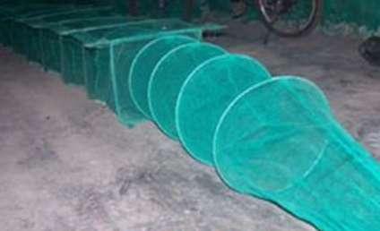 該漁具呈長柱形,一般長34米、高與寬各為25厘米,分1314節(jié),每節(jié)用方形鐵絲框固定,近似正方形。每節(jié)縫一個(gè)進(jìn)蝦口,內(nèi)設(shè)倒須,青蝦只能進(jìn)不能出。網(wǎng)的一端封死,另一端用繩扎緊成集蝦囊袋。全網(wǎng)用聚乙烯網(wǎng)布制成,網(wǎng)目可視青蝦起捕規(guī)格確定,一般152厘米。