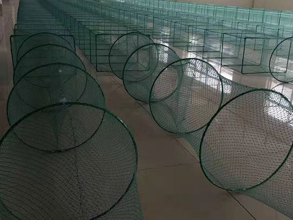 地籠制作選用直徑4--6毫米的鋼筋,加工制成40厘米的正方形框架,每50厘米為一節(jié),用鋼繩連接起來(lái),外面再用聚乙烯網(wǎng)布包纏,網(wǎng)的兩端或中間制成網(wǎng)兜。每節(jié)設(shè)一個(gè)進(jìn)口,框架與框架的網(wǎng)片上做成須門(mén),使魚(yú)、蝦等只能進(jìn)不能出。每相連兩節(jié)的進(jìn)蝦口方向相反,這樣可捕來(lái)自兩個(gè)方向的魚(yú)蝦。地籠的長(zhǎng)度可依據(jù)養(yǎng)殖水面的長(zhǎng)度、寬度而定,一般為20節(jié)左右,總長(zhǎng)約3米~30米不等。